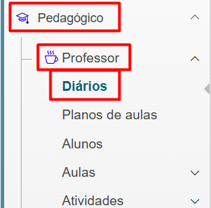 1 - Acesse o menu Pedagógico > Professor > Diários.