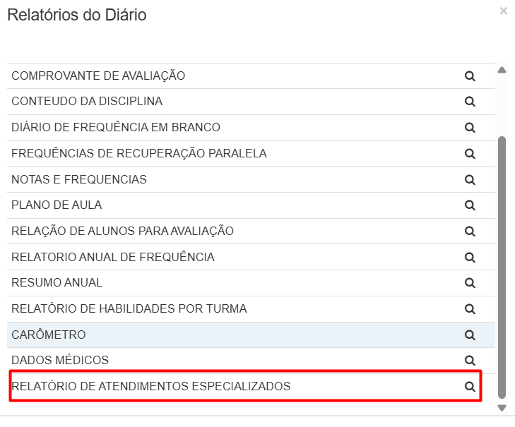 4 - Clique na opção Relatório de Atendimentos Especializados.