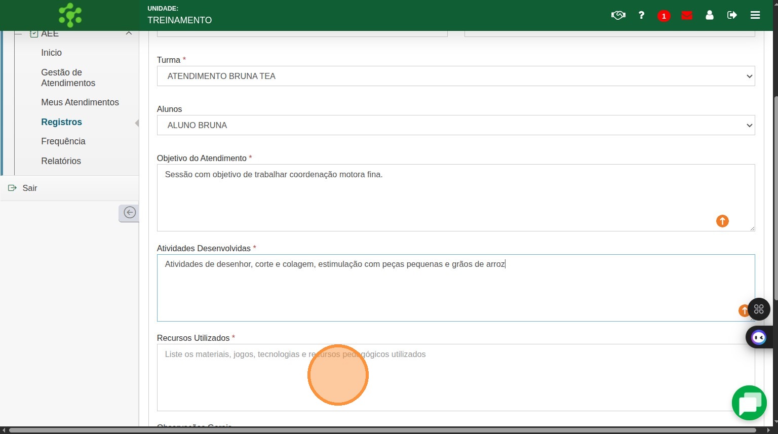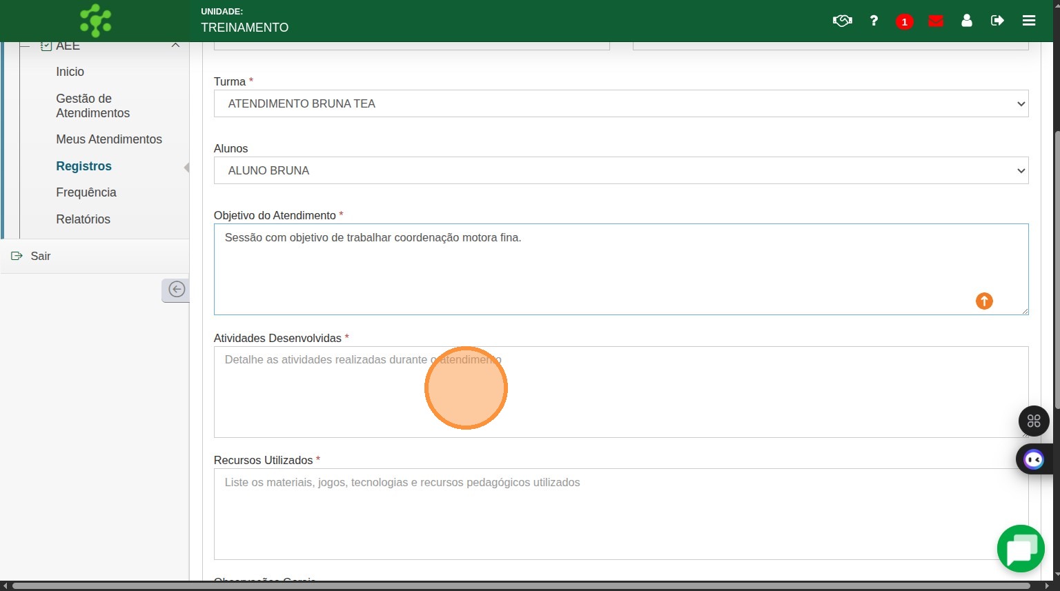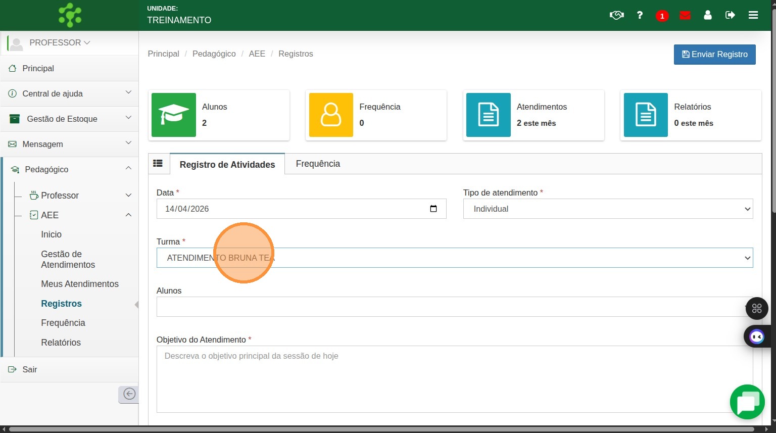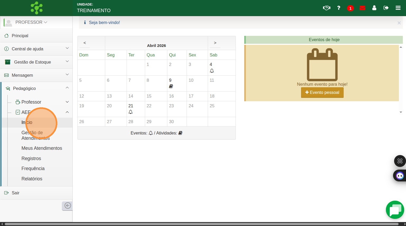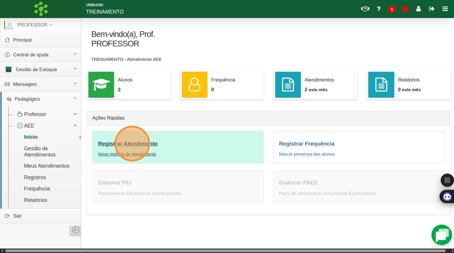 1. Acesse o menu Pedagógico > Professor > AEE > Inicio