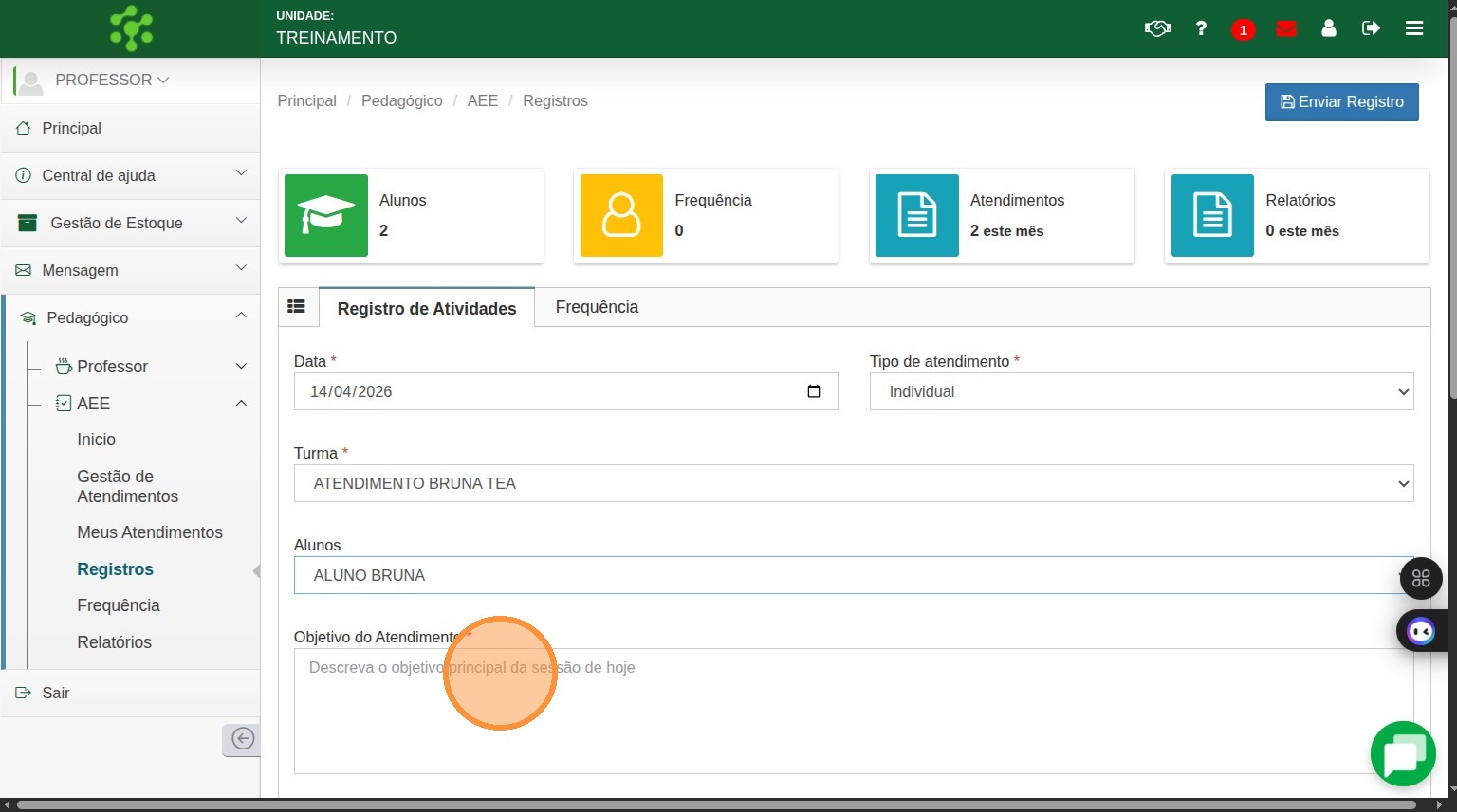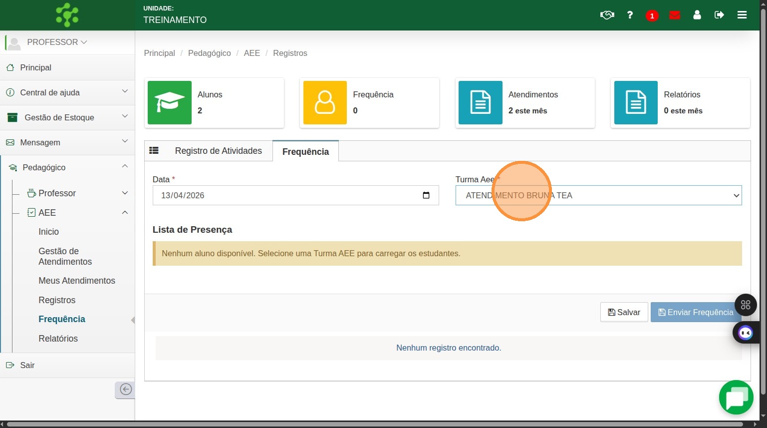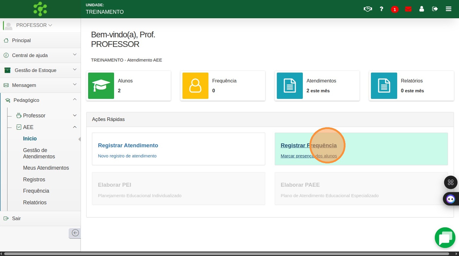 1. Acesse o menu pedagógico > professor > AEE > Inicio e clique em Registrar Frequência