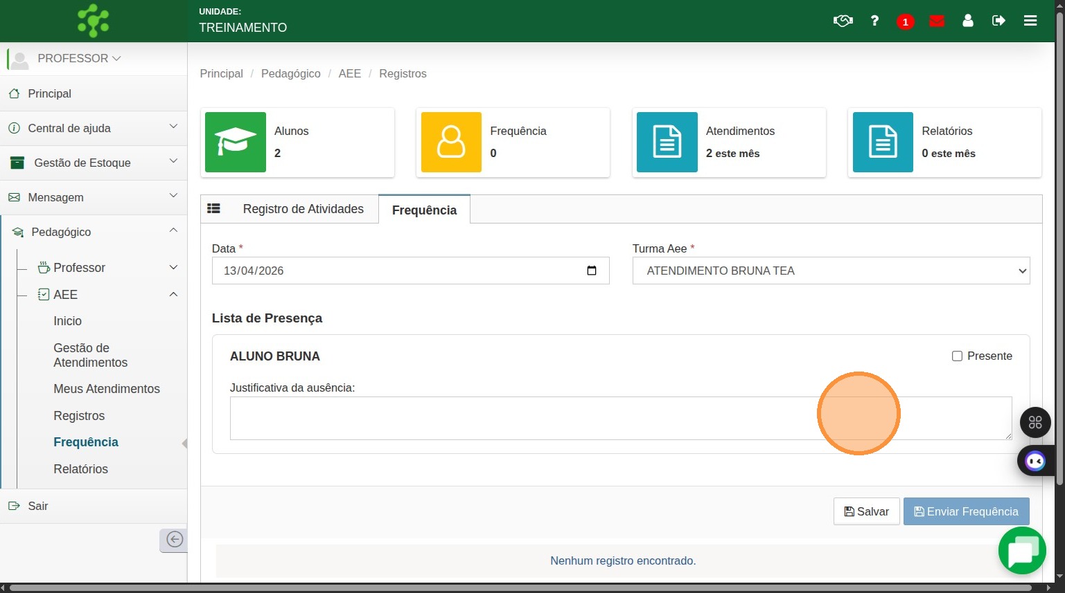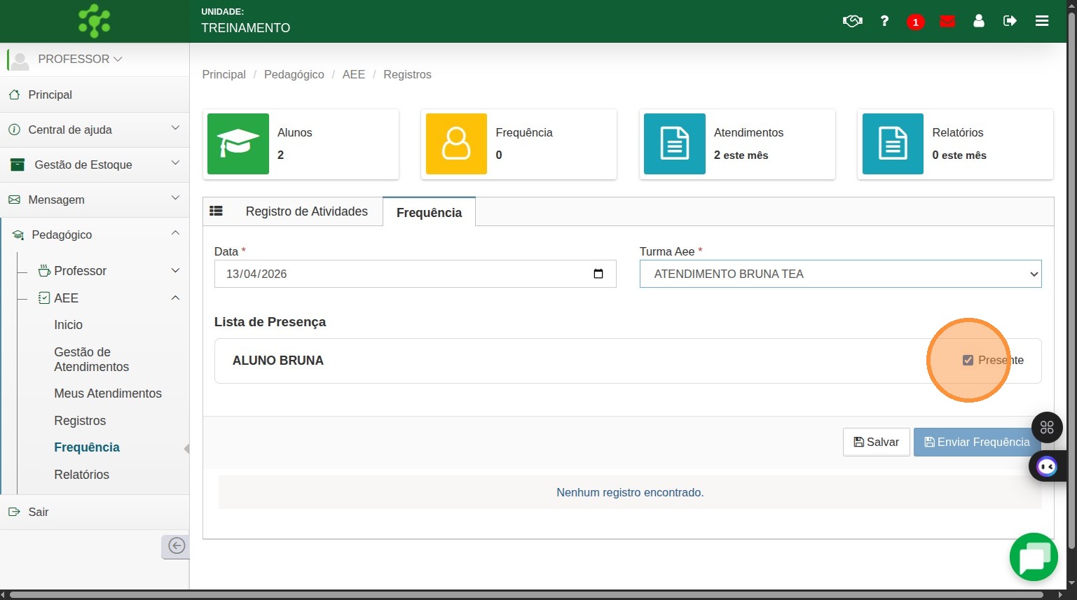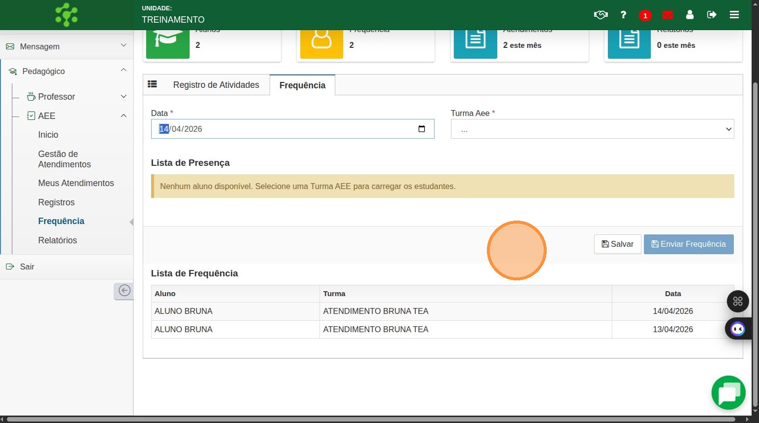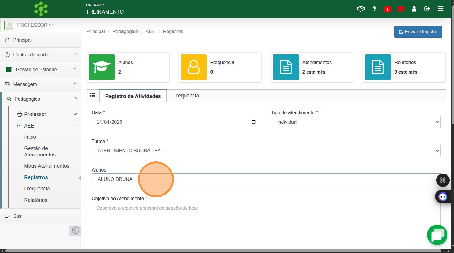 1. Acesse o menu pedagógico > professor > AEE > Inicio e clique em Registrar Frequência