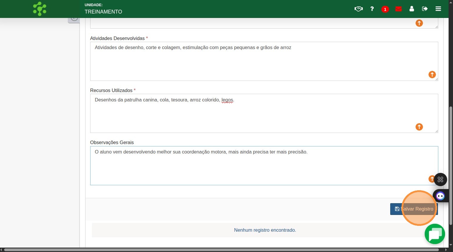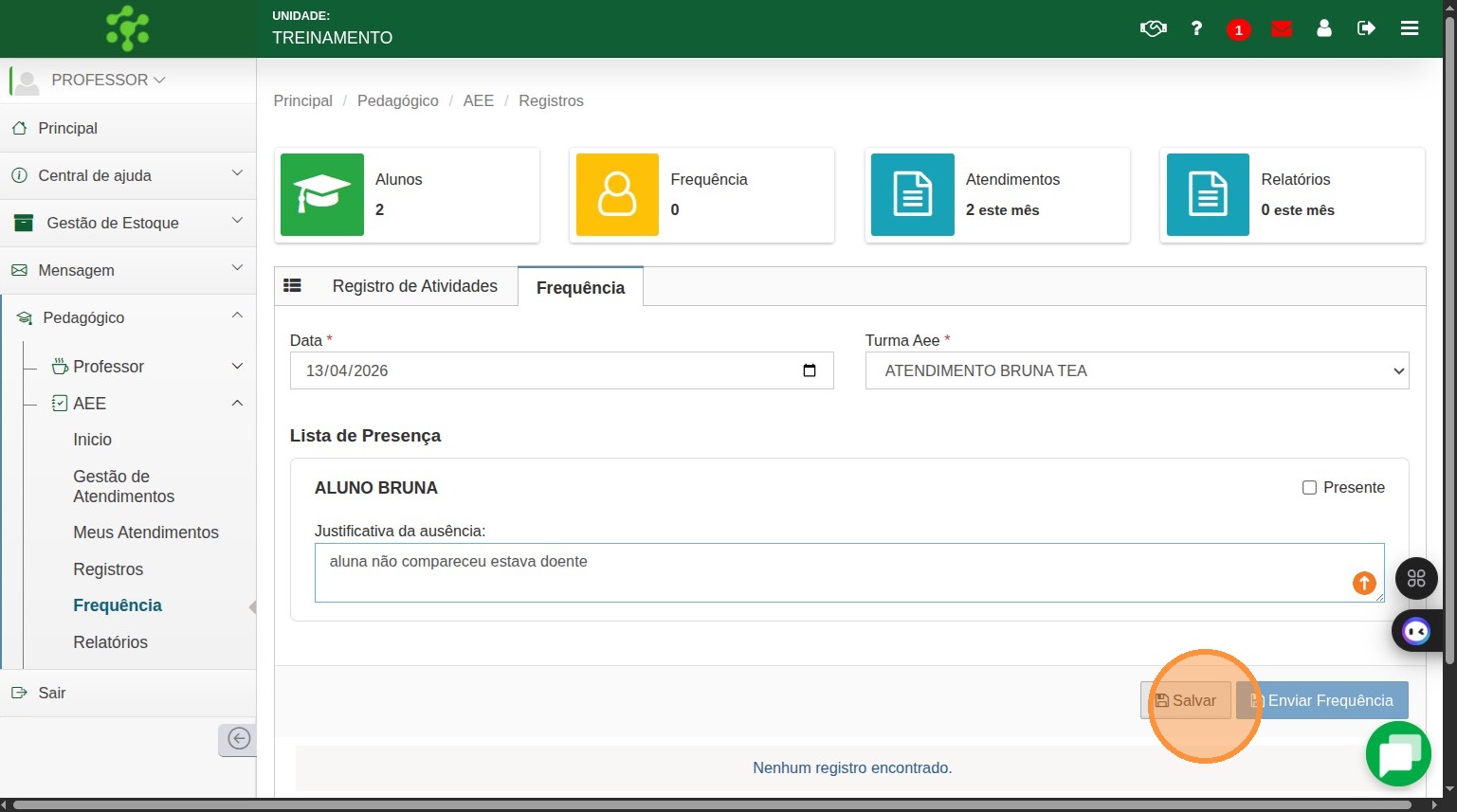 5. Após realizar o registro da frequência ou ausência do aluno clique no botão salvar