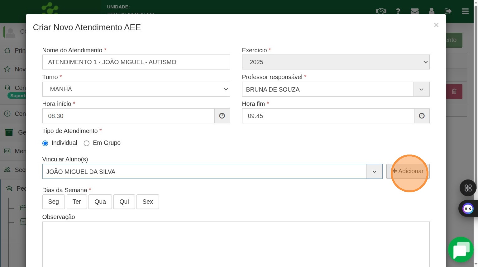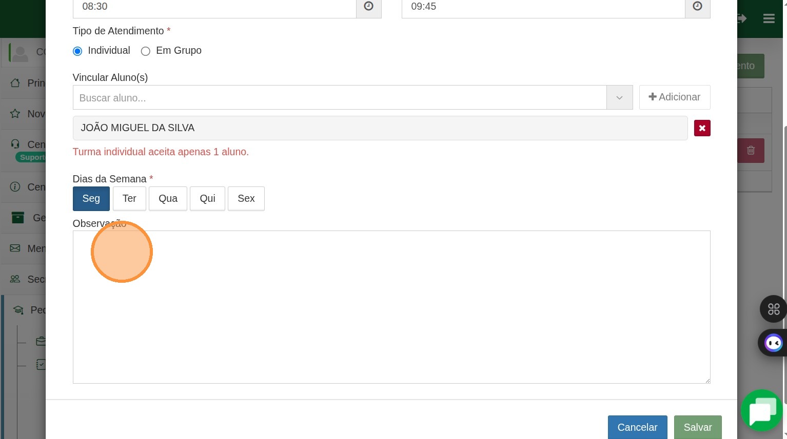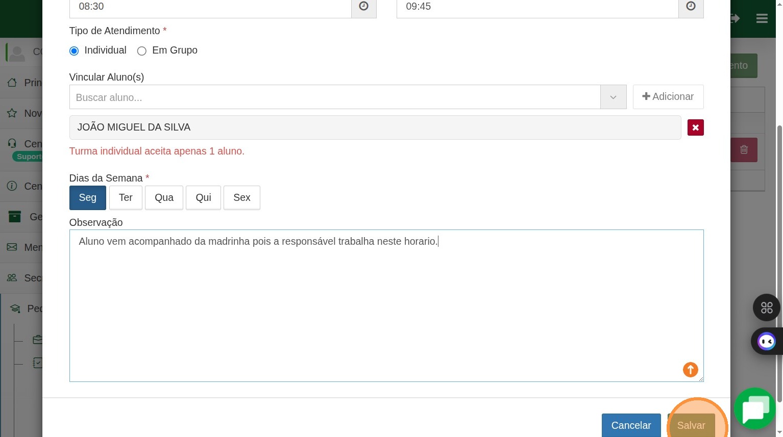 7. Note que como esse atendimento é individual o sistema avisa que só poderá constar um aluno nesse atendimento.