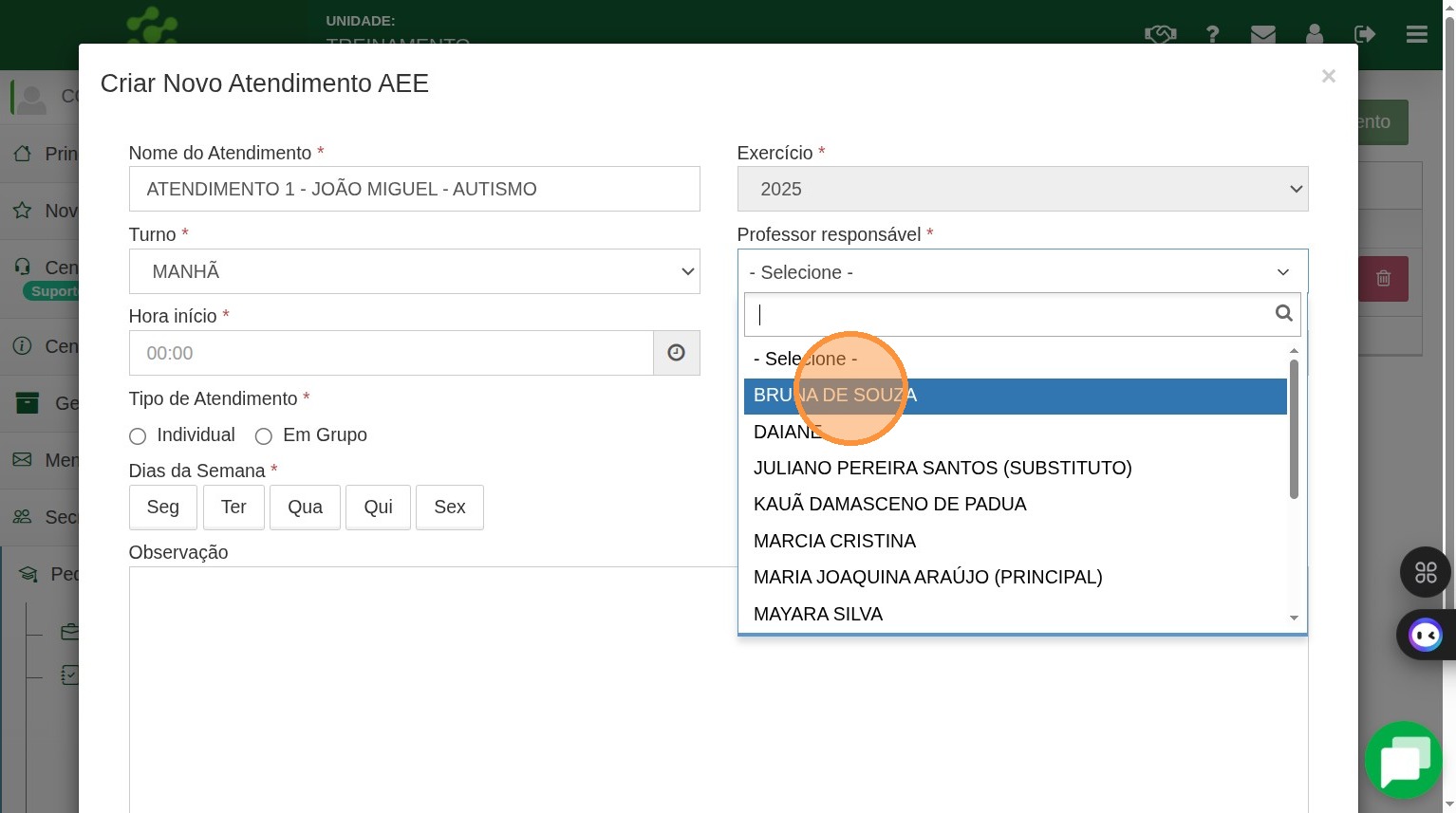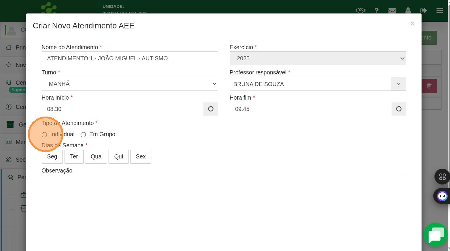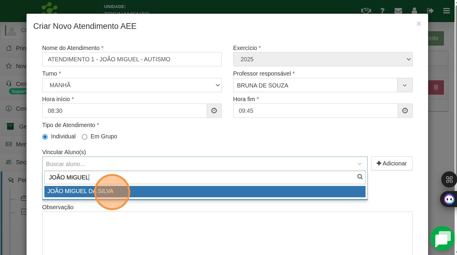 7. Note que como esse atendimento é individual o sistema avisa que só poderá constar um aluno nesse atendimento.