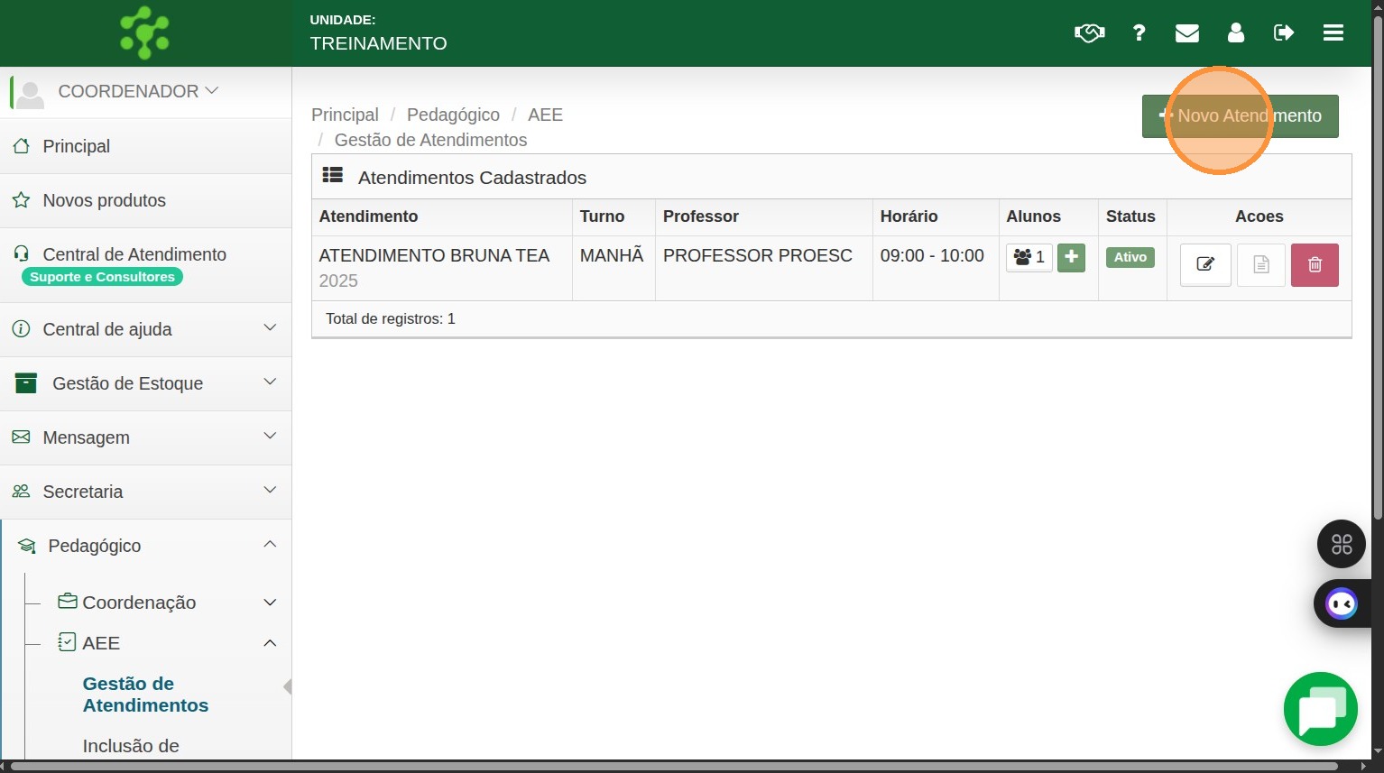 1. Para criar um atendimento individual acesse o menu Pedagógico > AEE > Gestão de Atendimentos