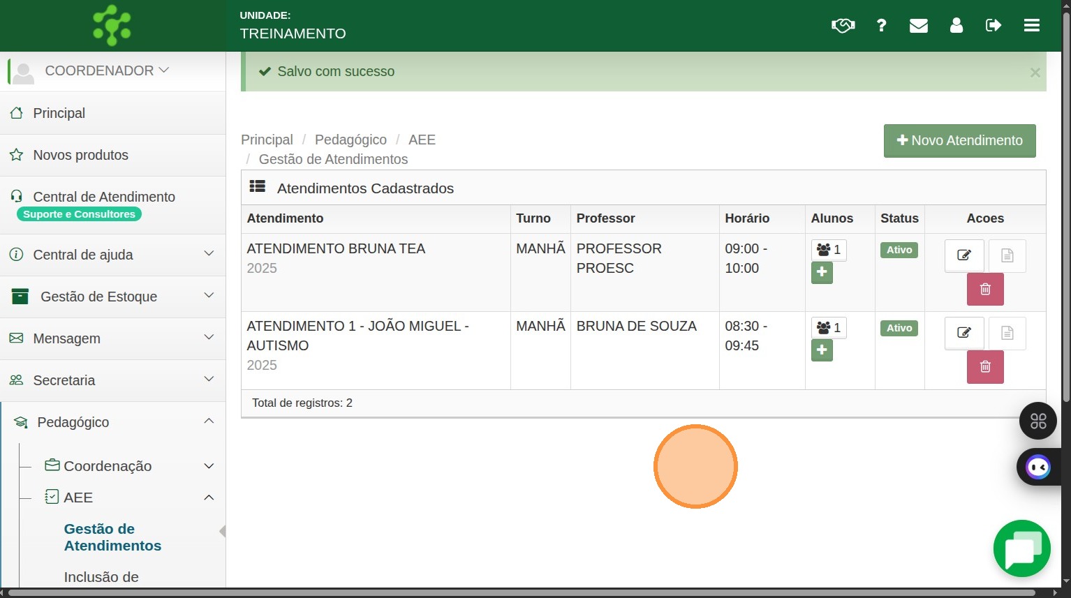 9. O sistema exibirá a mensagem "Salvo com sucesso" e você será redirecionado para a tela principal de Gestão de Atendimentos.