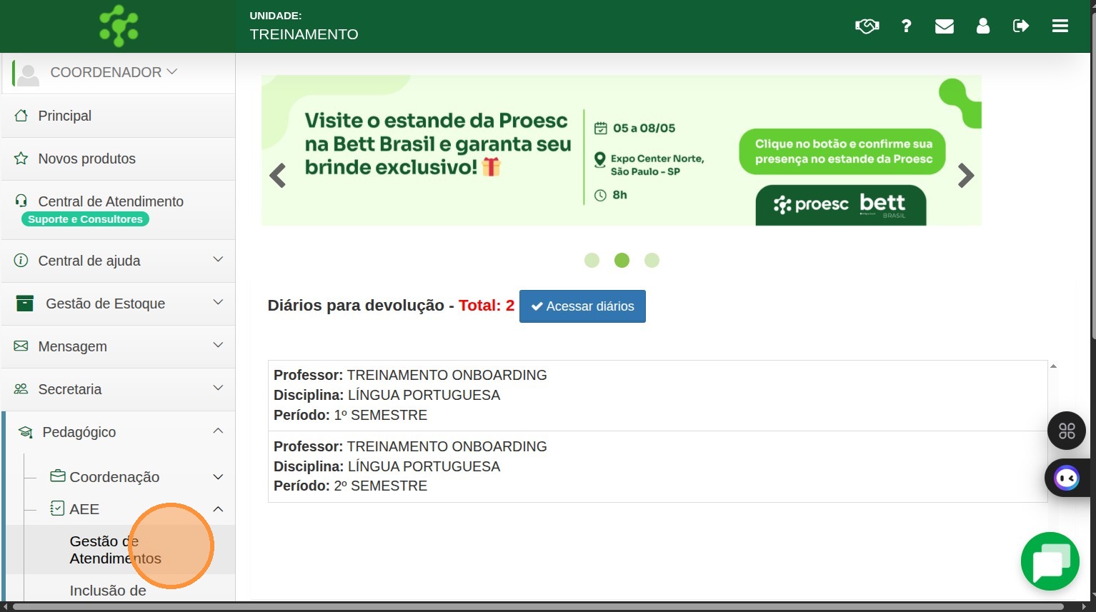 DISPONÍVEL PARA: Usuários com perfis de Professor, Coordenador e Secretária